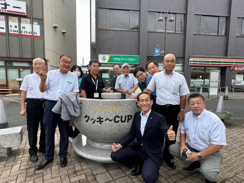 久喜駅東口駅前ロータリーに、コーヒーカップ型のベンチを寄贈しました。